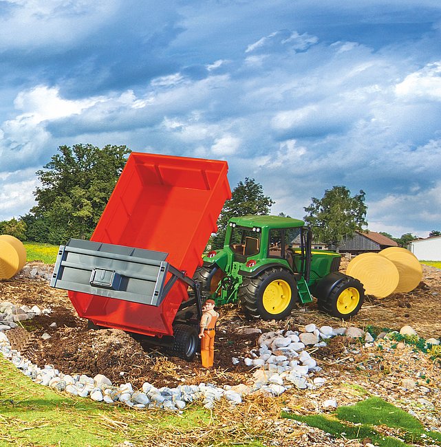 Il rimorchio ribaltabile con sponda posteriore ad apertura automatica, numero articolo 02211, è adatto per bambini dai 3 anni in su. I rimorchi ribaltabili sono strumenti essenziali nell'agricoltura quotidiana e anche i piccoli agricoltori BRUDER troveranno questo rimorchio indispensabile. Come nel modello reale, il cassone del rimorchio può essere sollevato, attivando l'apertura automatica della sponda posteriore. Il sistema di apertura può essere riposizionato per utilizzare il regolatore di scarico del grano. Un piede d’appoggio garantisce un arresto sicuro, mentre gli pneumatici profilati completano il design. Il rimorchio ribaltabile è compatibile con tutti i trattori BRUDER.